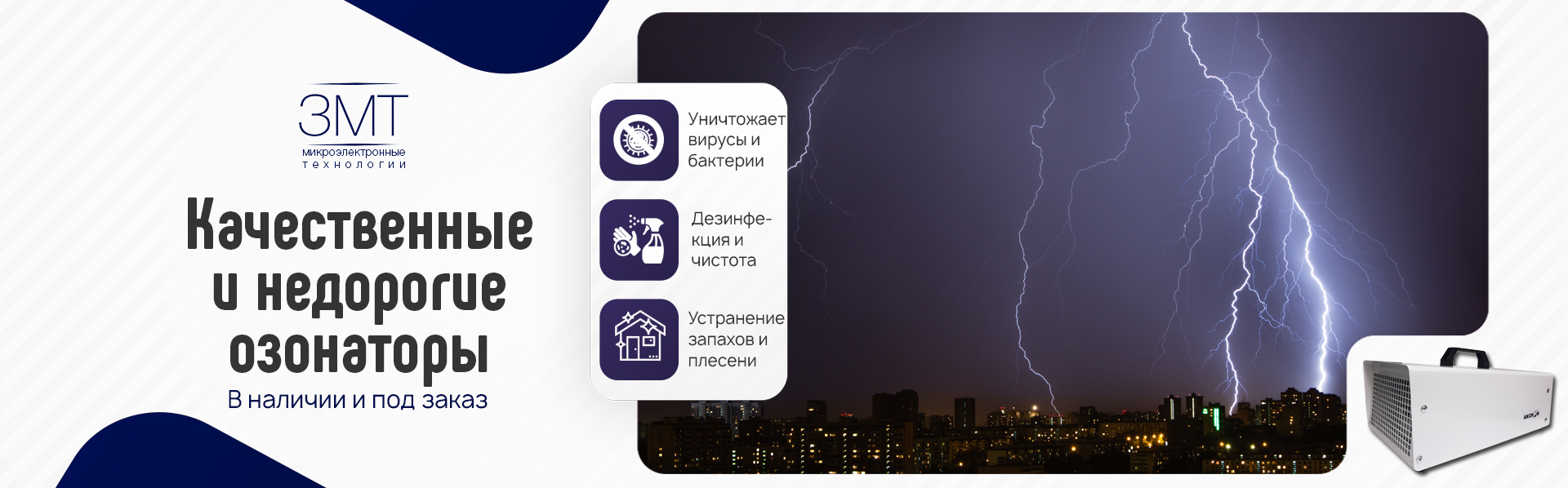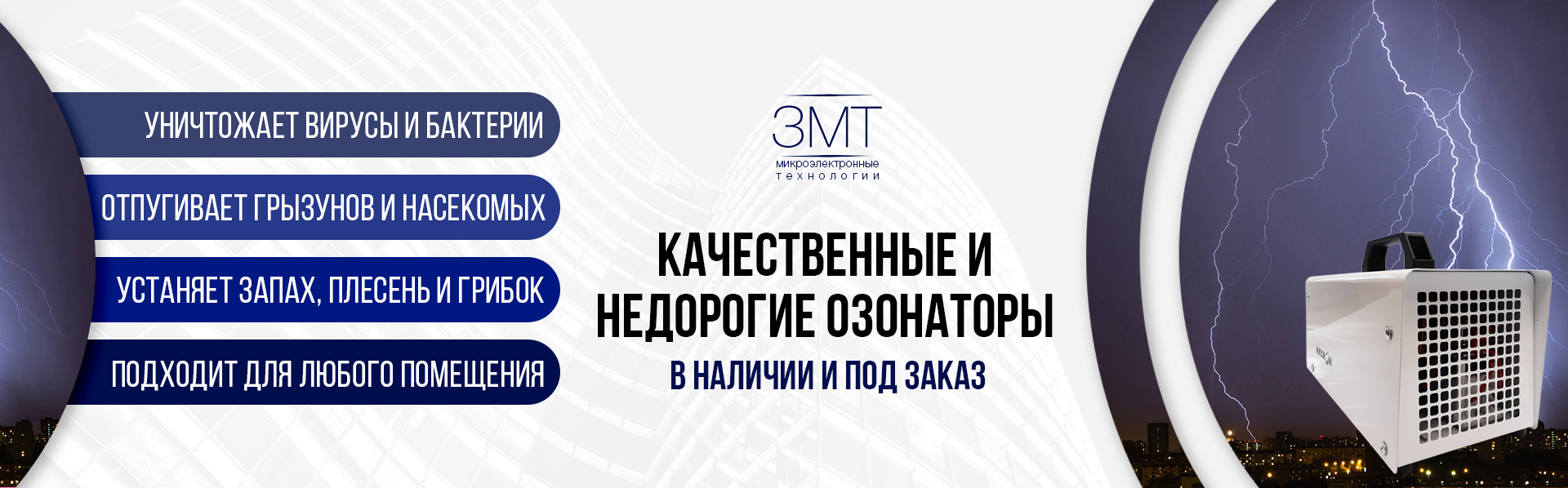 Наша компания занимается производством и продажей промышленных, офисных и бытовых озонаторов воздуха разных мощностей и комплектации. Мы имеем большой опыт в подборе оборудования для дезинфекции воздуха и помещений. Работаем во всех регионах России.